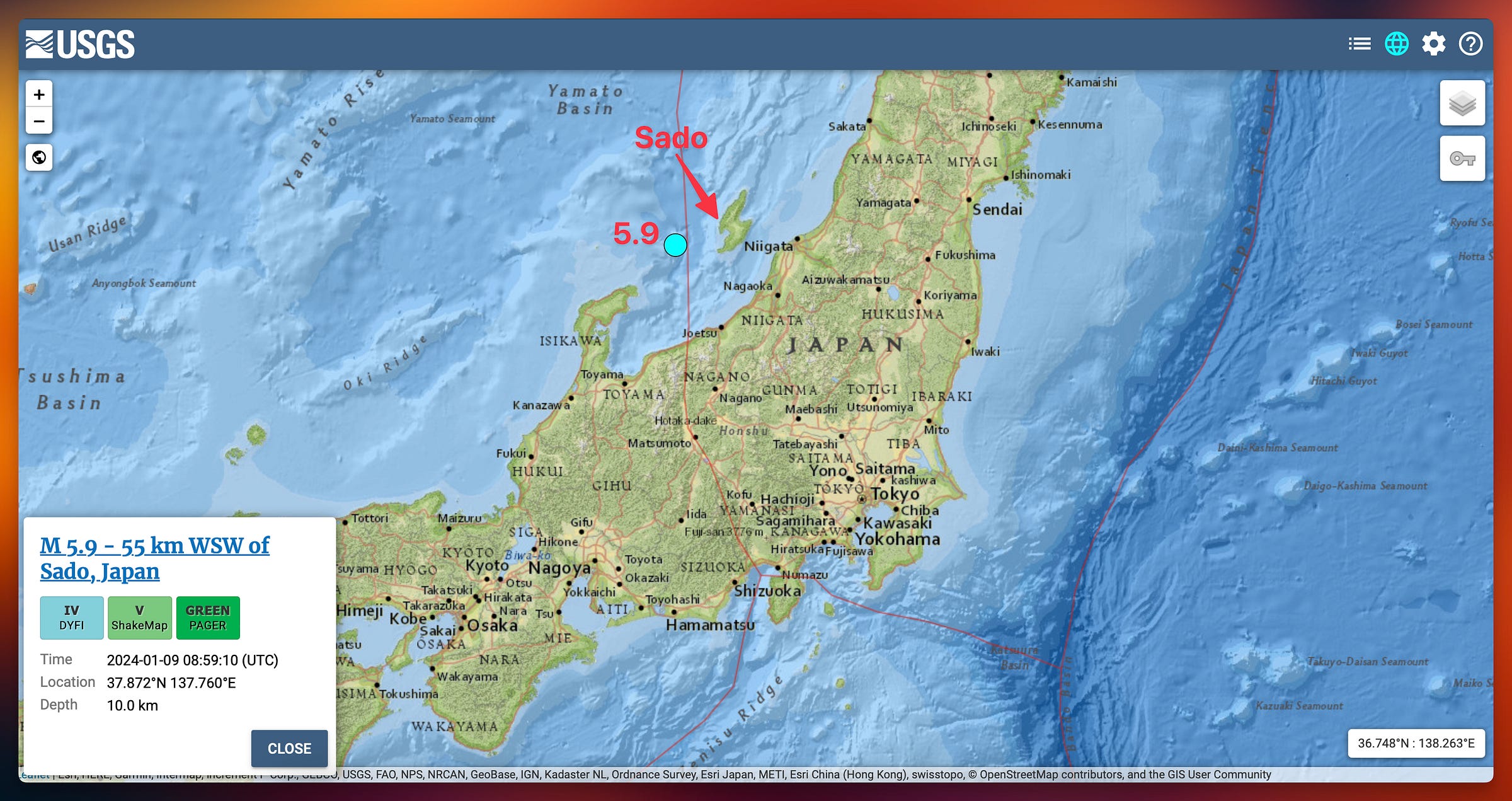 Below is a zoomed-in map of the 5.9 magnitude earthquake with an epicenter that’s 55km (34 miles) away from Sado Island: