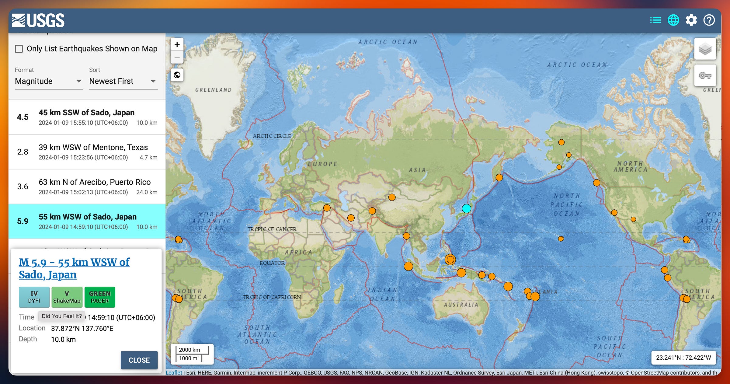 "Earthquake Map." U.S. Geological Survey. Accessed January 9, 2024. https://earthquake.usgs.gov/earthquakes/map/?currentFeatureId=us6000m2ny&extent=33.19273,130.70435&extent=39.3343,146.52466&range=search&sort=largest&baseLayer=terrain&timeZone=utc&list=false&search=%7B%22name%22:%22Search%20Results%22,%22params%22:%7B%22starttime%22:%222024-01-02%2000:00:00%22,%22endtime%22:%222024-01-09%2023:59:59%22,%22minmagnitude%22:5.5,%22orderby%22:%22magnitude%22%7D%7D.